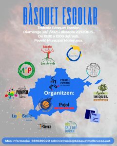El 30 de novembre i el 20 de desembre tindran lloc dues trobades escolars de bàsquet en col-col·laboració amb el Club Bàsquet Mollerussa que exporta el seu esport a les extraescolars de les escoles de Mollerussa i part de la comarca amb l’ajuda del Consell Esportiu del Pla d’Urgell.