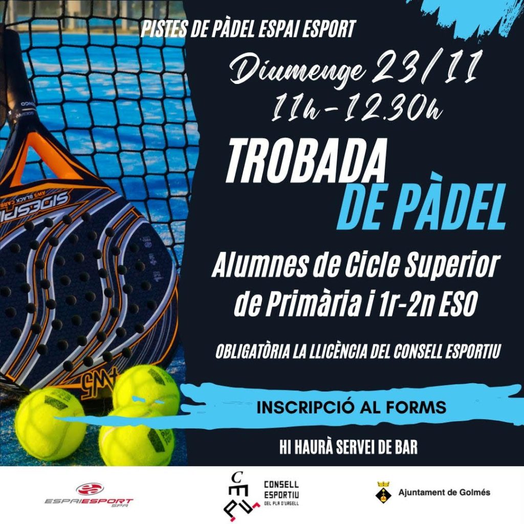 Aquest diumenge trobada de pàdel escolar a les nostres instal·lacions, gaudiu d’aquest esport i formeu part de l’escola de Pàdel del Consell Esportiu del Pla d’Urgell.